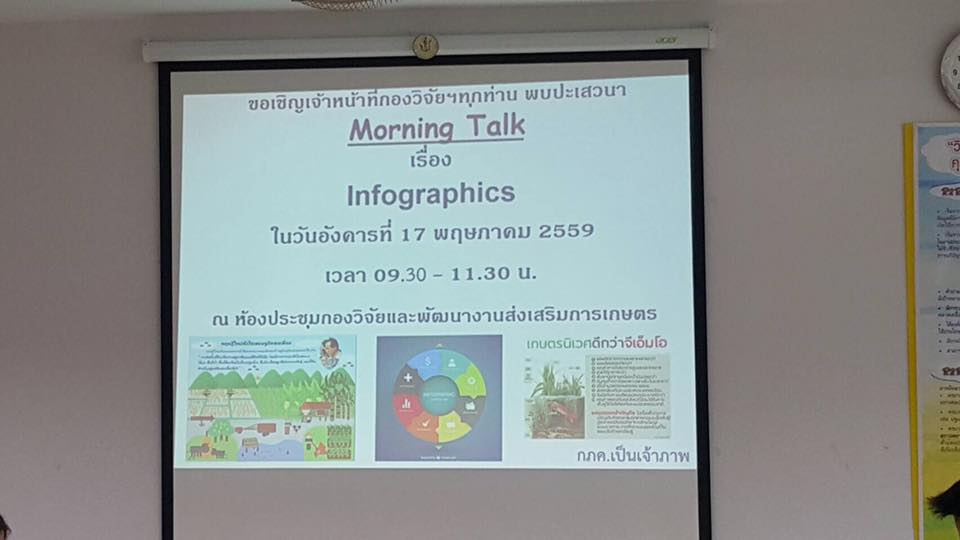 วันที่ 17 พฤษภาคม 2559 เวลา 9.30 น. กองวิจัยและพัฒนางานส่งเสริมการเกตรเปิดเวที morning talk เรื่อง Infographics มอบความรู้ให้แก่เจ้าหน้าในกอง ค่ะ 18 พฤษภาคม 2016 วันที่ 17 พฤษภาคม 25