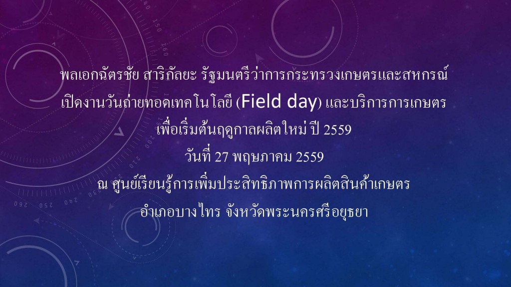 (เอกสาร) การเปิดงานวันถ่ายทอดเทคโนโลยี ( Field day ) และบริการการเกษตร 31 พฤษภาคม 2016 กองวิจัยและพัฒนางานส