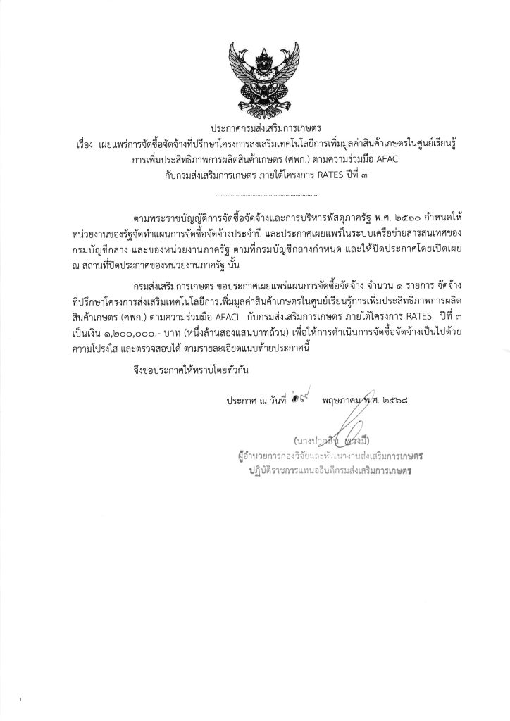 ประกาศกรมส่งเสริมการเกษตร เรื่อง เผยแพร่การจัดซื้อจัดจ้างที่ปรึกษาโครงการส่งเสริมเทคโนโลยีการเพิ่มมูลค่าสินค้าเกษตรในศูนย์เรียนรู้การเพิ่มประสิทธิภาพการผลิตสินค้าเกษตร (ศพก.) ตามความร่วมมือ AFACI กับกรมส่งเสริมการเกษตร ภายใต้โครงการ RATES ปีที่ 3 30 พฤษภาคม 2025 ประกาศกรมส่งเสริมการ