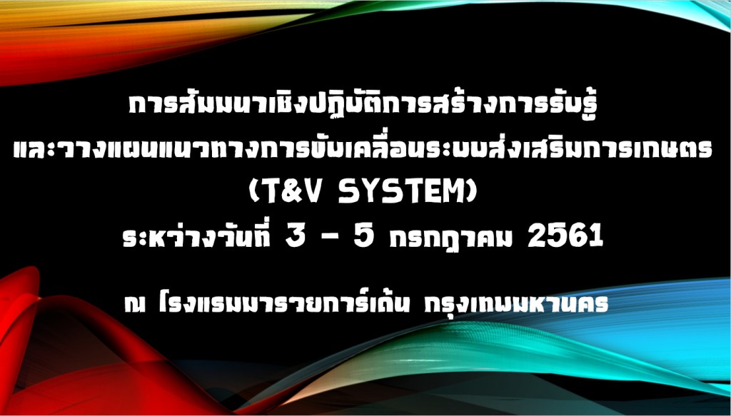 การสัมมนาเชิงปฏิบัติการสร้างการรับรู้ และวางแผน แนวทางการขับเคลื่อนระบบส่งเสริมการเกษตร (T&V System) 06 กรกฎาคม 2018 การสัมมนาเชิง
