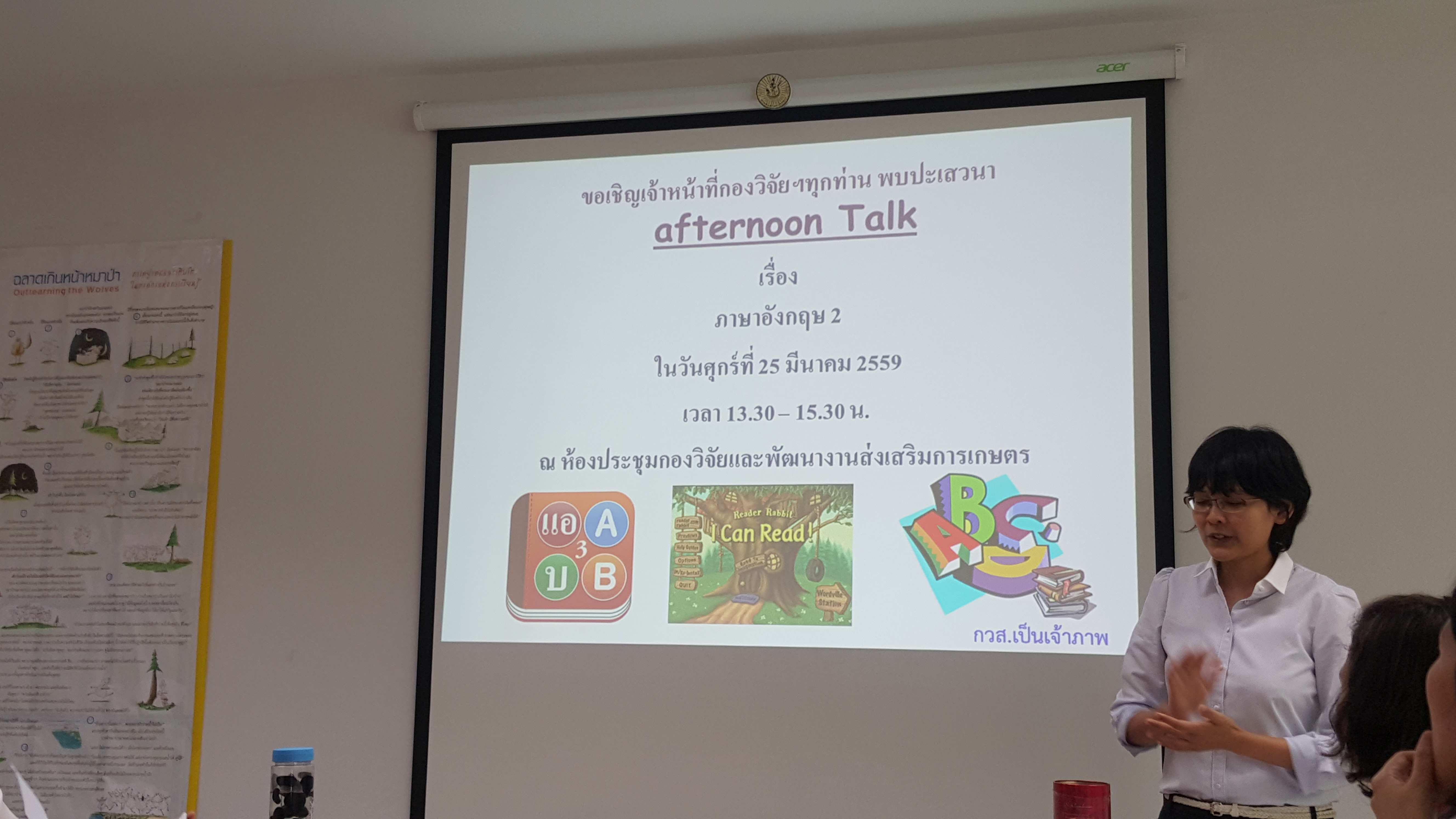 คณะทำงานการจัดการความรู้ ได้จัดเวที Afternoon Talk ครั้งที่ 6/59 เพื่อพัฒนาเจ้าหน้าที่กองวิจัยและพัฒนางานส่งเสริมการเกษตรด้านภาษาอังกฤษ โดยได้เชิญอาจารย์ศิรส สุวรรณมณี นักวิชาการเกษตรปฏิบัติการ กลุ่มคุณภาพและมาตรฐานสินค้าเกษตร สำนักส่งเสริมและจัดการสินค้า มาเป็นวิทยากร ณ ห้องประชุมกองวิจัยและพัฒนางานส่งเสริมการเกษตร ชั้น 2