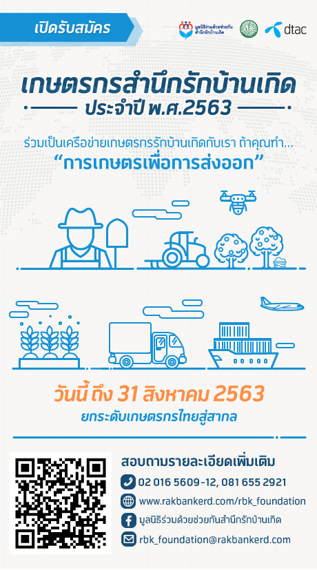 ด้วยมูลนิธิร่วมด้วยช่วยกันสำนึกรักบ้านเกิด ร่วมกับดีแทค และกรมส่งเสริมการเกษตร เปิดรับสมัครเกษตรกรเข้าประกวดในโครงการ “ประกวดเกษตรกรสำนึกรักบ้านเกิด ประจำปี พ.ศ. 2563” ภายใต้แนวคิด “การเกษตรเพื่อการส่งออก” โดยเปิดรับสมัครแล้วตั้งแต่วันนี้ ถึงวันที่ 31 สิงหาคม 2563 อ่านรายละเอียดเพิ่มเติมได้ที่ : https://www.rakbankerd.com/rbk_foundation/relation/open.php?id=51