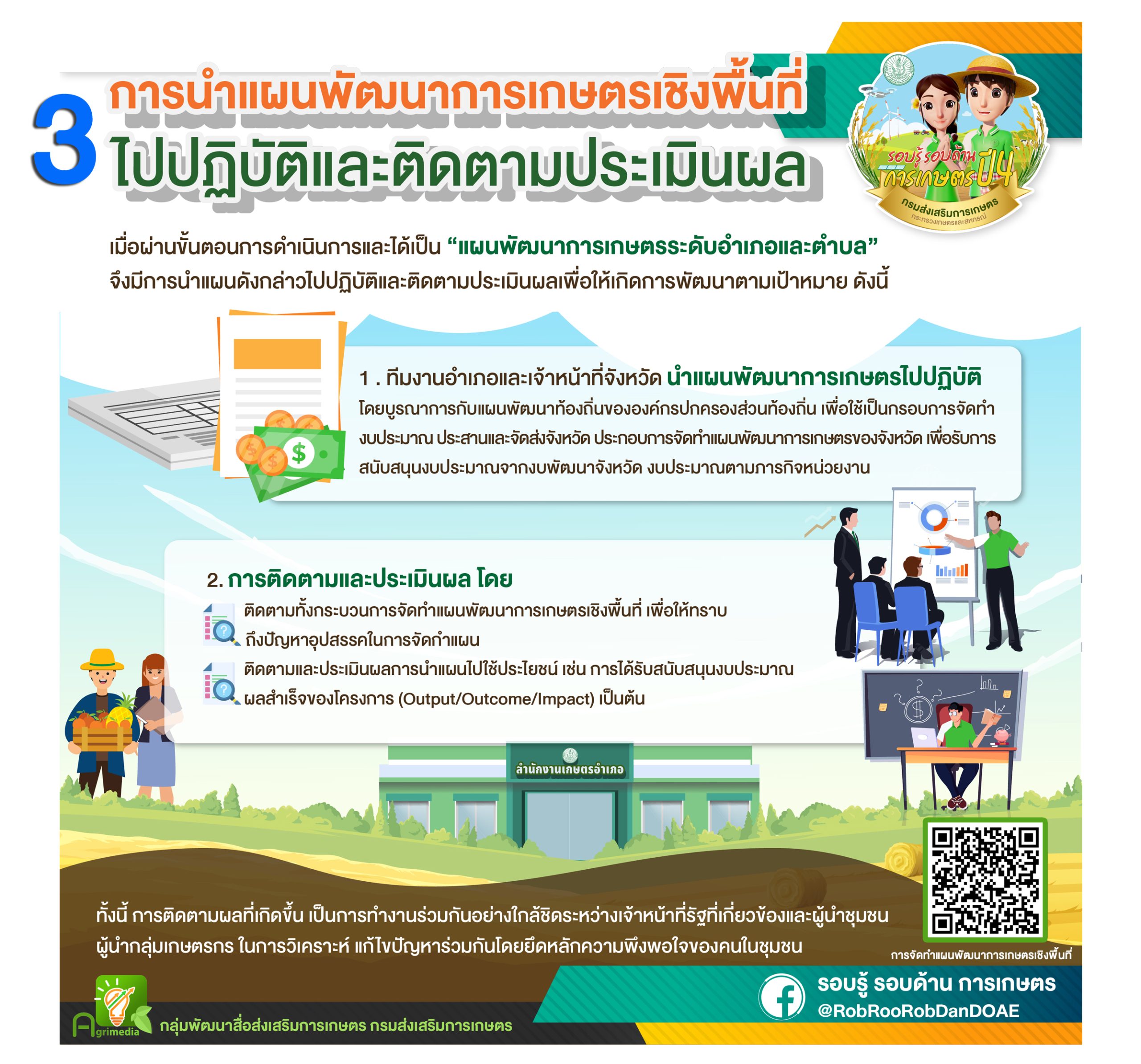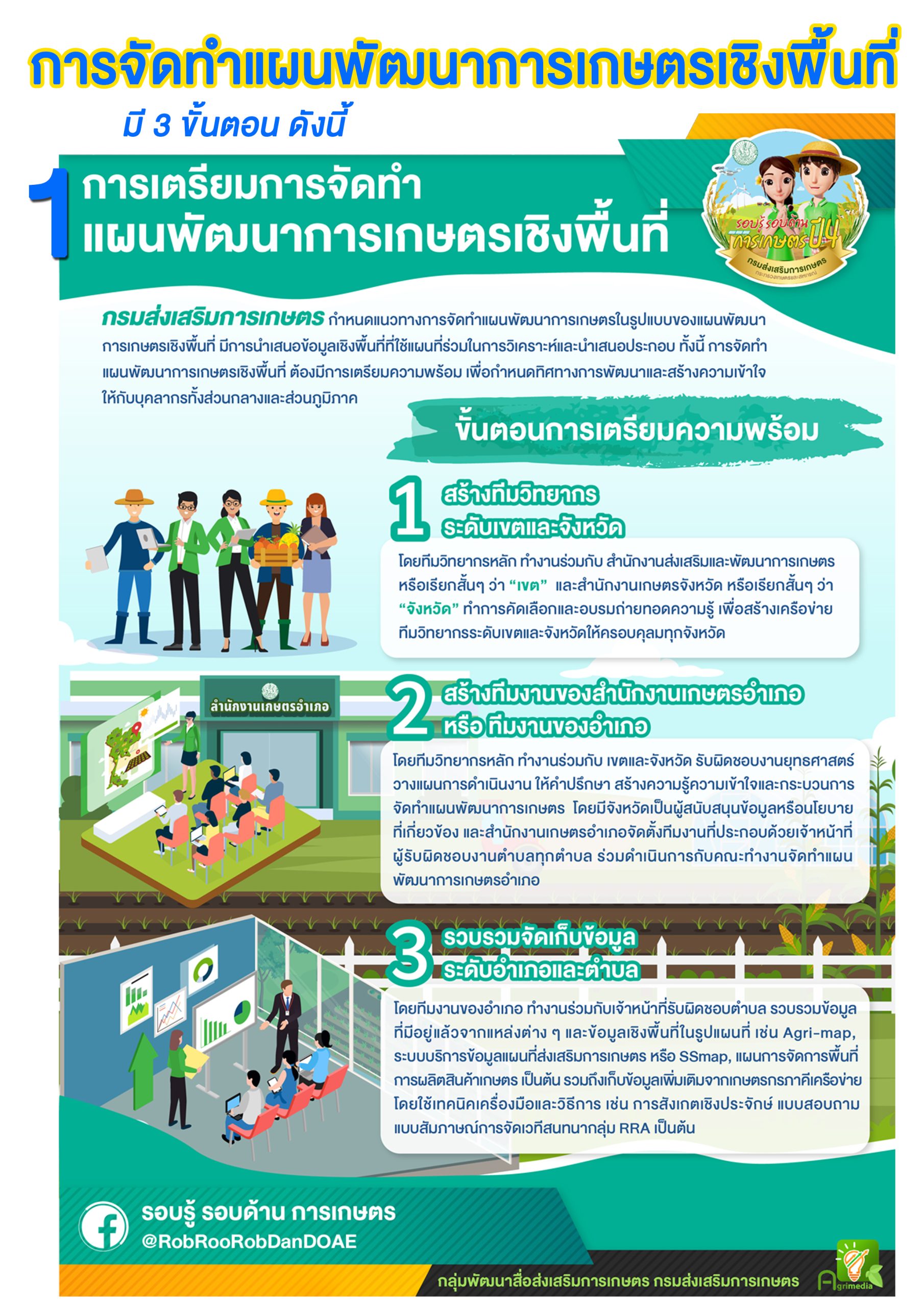 กรมส่งเสริมการเกษตร ได้จัดทำแผนพัฒนาการเกษตรเชิงพื้นที่ มุ่งเน้นการเรียนรู้และพัฒนานักส่งเสริมการเกษตรให้มีความรู้ความเข้าใจในการส่งเสริมการเกษตรเชิงพื้นที่ จากการปฏิบัติงานจริง เมื่อได้จัดทำแผนพัฒนาการเกษตรเชิงพื้นที่ เพื่อเป็นการกำหนดทิศทางการพัฒนาแล้ว จึงเริ่มเข้าสู่ขั้นตอนการดำเนินการ